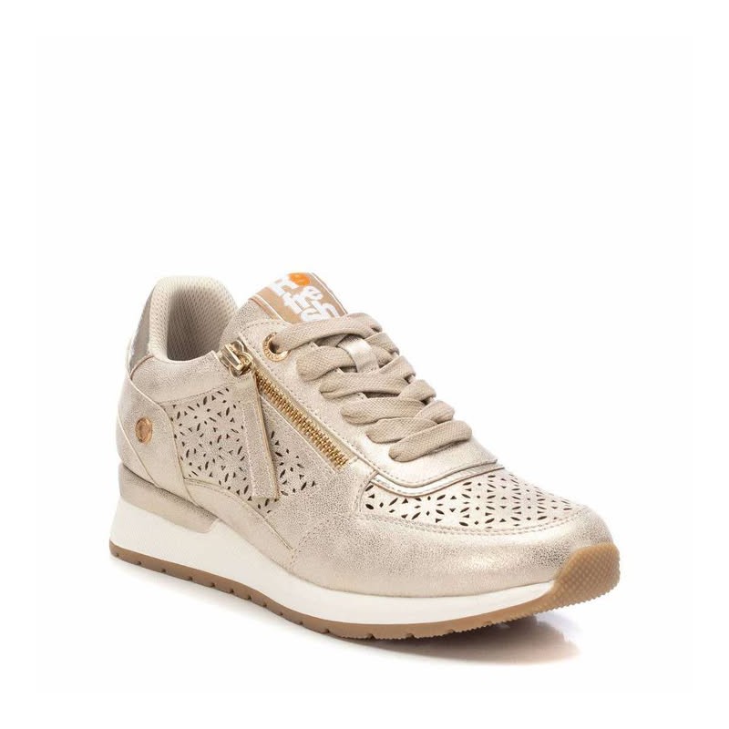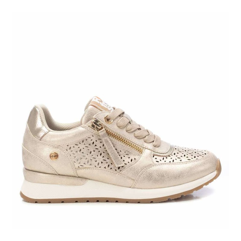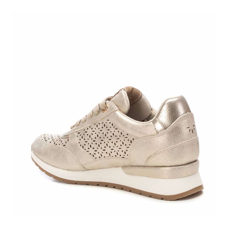 Com recortes laser e fecho lateral dourado, estas sapatilhas combinam o charme metálico com um design moderno e feminino.