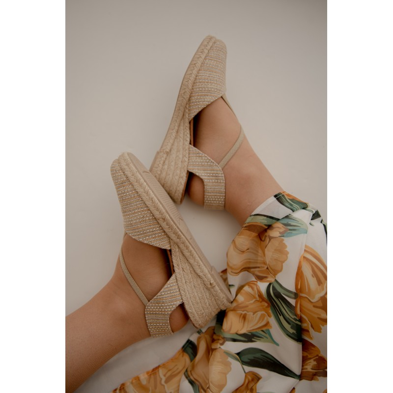 Feitas com materiais de alta qualidade e um acabamento artesanal impecável, estes sapatos apresentam um design em tecido entrançado com brilho subtil, que se adapta com leveza ao pé. A palmilha acolchoada e a cunha em corda conferem estabilidade, elegância e um conforto que dura o dia todo — ideal para passeios longos, fins de tarde na esplanada ou até um dia mais casual no trabalho. É uma escolha consciente, pensada para mulheres que valorizam a leveza nos pés e a sofisticação no andar.