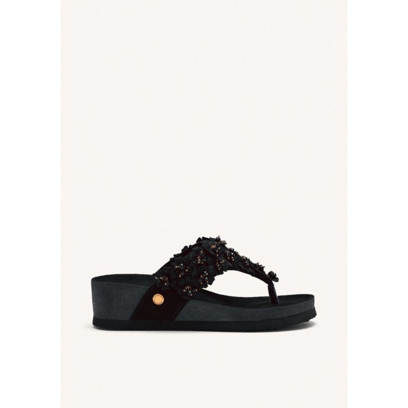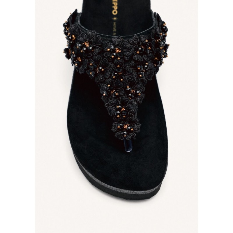 O design destaca-se pelos detalhes florais tridimensionais bordados com pedraria preta e fios dourados que evocam luxo e cuidado artesanal. Cada passo é acolhido por uma palmilha suave e anatómica, projetada para proporcionar suporte e conforto ao longo de todo o dia, seja num passeio descontraído à beira-mar ou num jantar ao ar livre numa noite de verão.