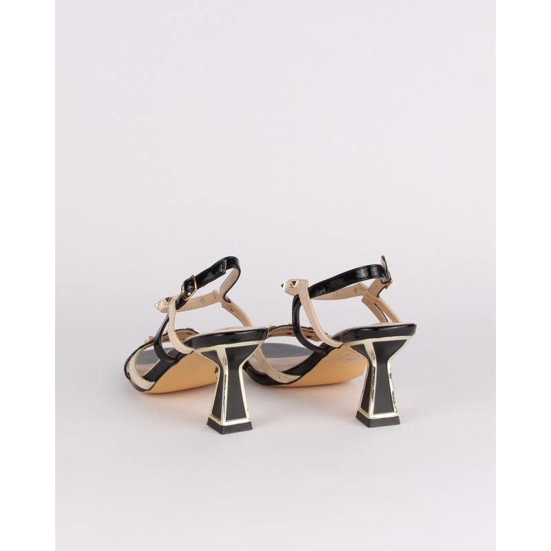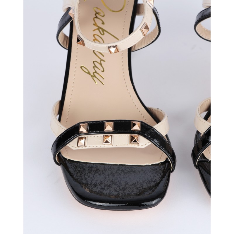 O seu salto com a base larga e com delineado dourado, ajuda a garantir estabilidade e a beleza ao pé assim como as tachas douradas que adornam esta sandália.