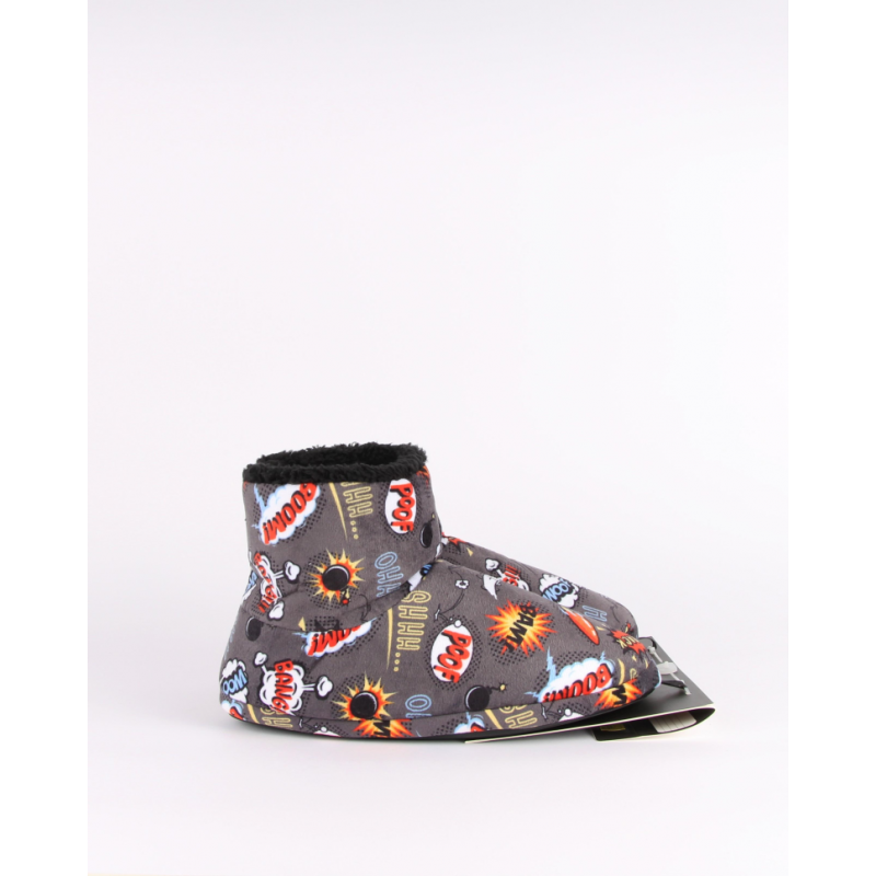 O design em tecido cinza com padrão gráfico divertido dá um toque moderno e descontraído, tornando estas pantufas diferentes e cheias de personalidade.